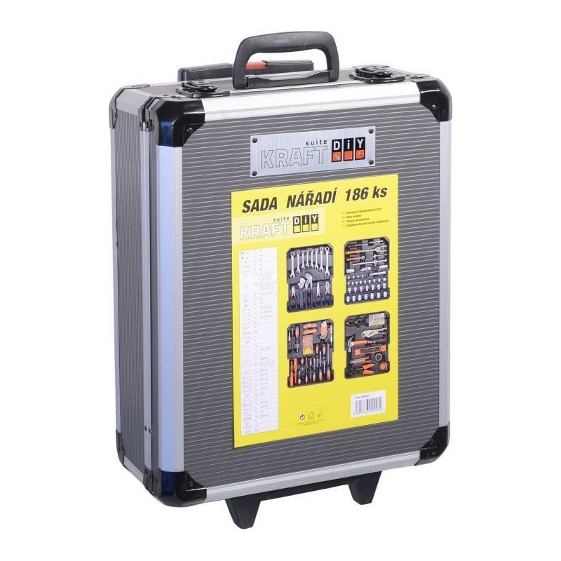 Der Koffer ist mit einem Teleskopgriff und Rollen ausgestattet, was die Handhabung des gesamten Werkzeugsatzes erleichtert. Das Set enthält verschiedene Zangen, Schraubendreher, Schraubenschlüssel, einen Hammer, eine Wasserwaage, Seiten- und Sechskantschlüssel, Bits, Befestigungselemente für den Sockel und viele weitere Werkzeuge, die sich für den Einsatz zu Hause, in der Garage sowie unterwegs eignen.