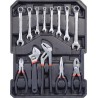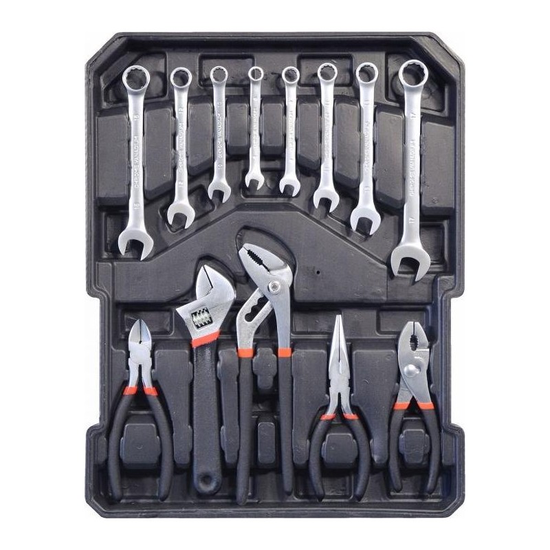 Zangen 1x 150 mm 1x Verstellschlüssel 200 mm 1x Zange 230 mm 1x Zange 150 mm 1x Universalzange 150 mm 8x Kombischlüssel (8, 9, 10, 11, 12, 13, 15, 17)