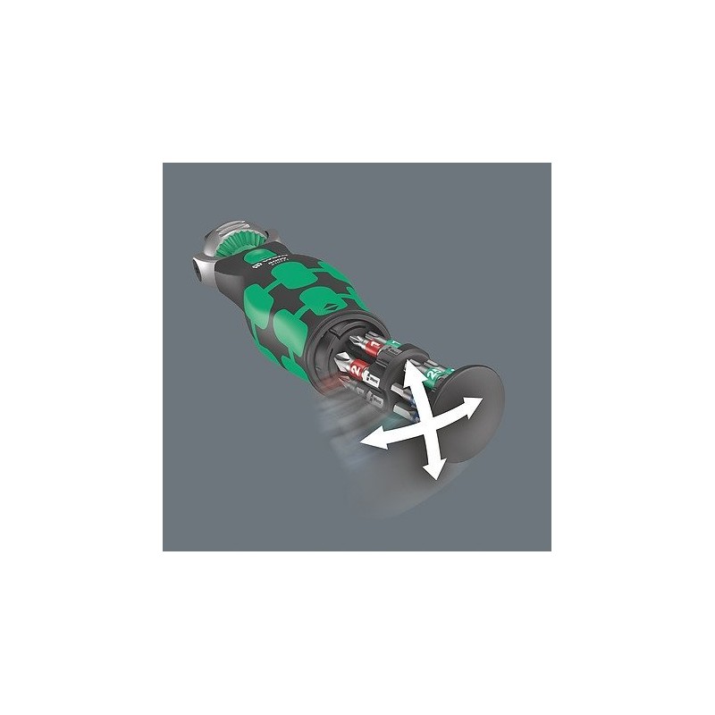 Im Griff der kompakten Zyklop-Ratsche befindet sich ein gegen Verlust gesichertes, frei drehbares Magazin für 12 Bits (1/4", Länge 25 mm).