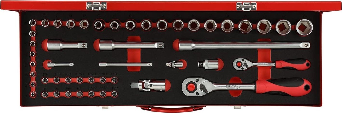 enthaltene Werkzeuge: Ratsche, Steckschlüssel, Steckschlüsseleinsätze