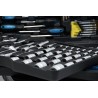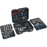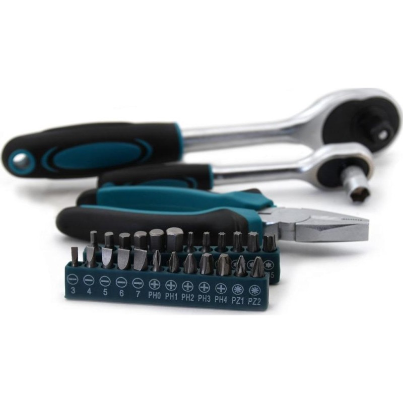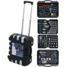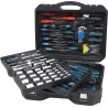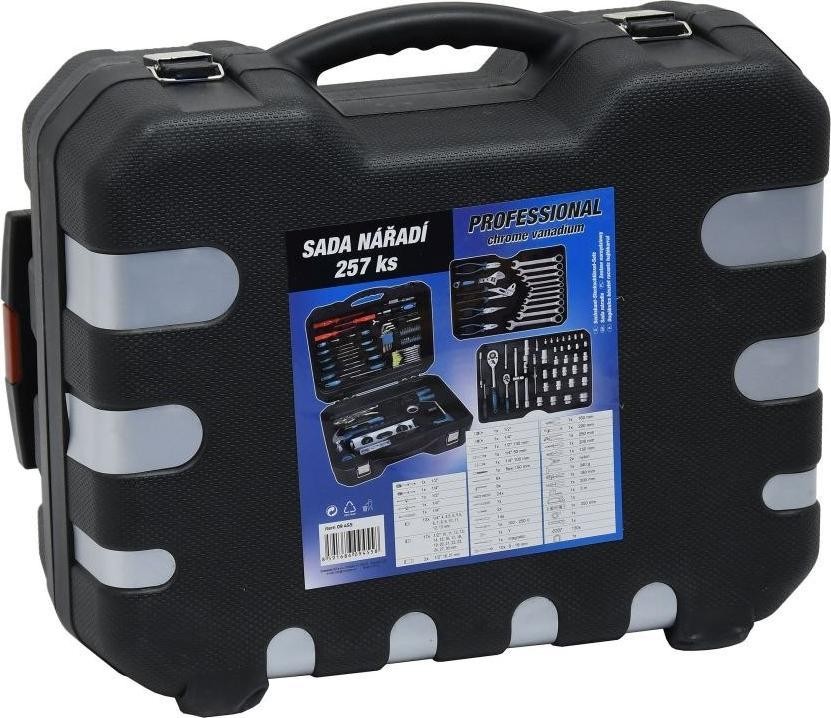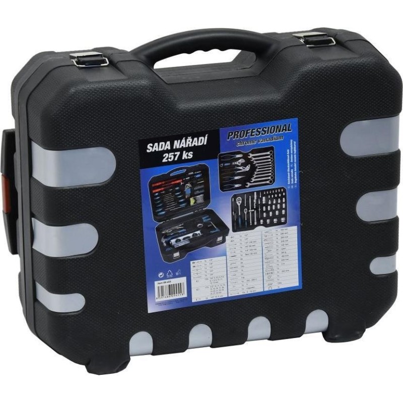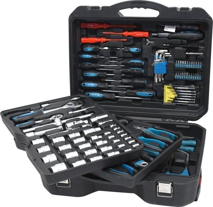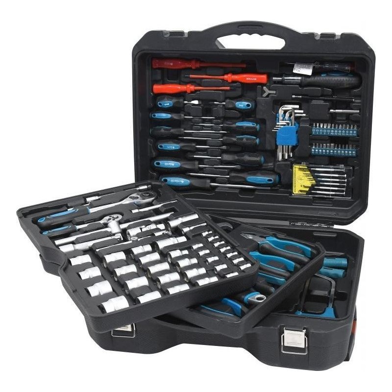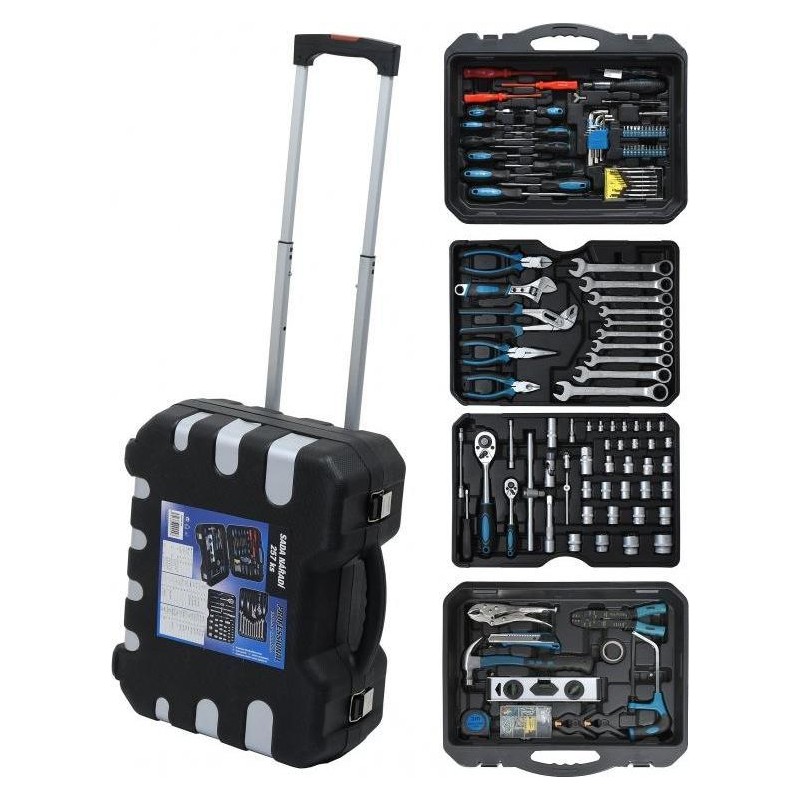 Ein professioneller Werkzeugkoffer, ausgestattet mit hochwertigen Werkzeugen, darunter Ratschen mit sehr feinem Mechanismus und Verschlüssen, die übersichtlich an festen Positionen angeordnet sind. Die untere Platte enthält einen Hammer, ein Messgerät, eine Selbstspannzange und eine Abisolierzange, Verbindungselemente und andere nützliche Werkzeuge für verschiedene Aufgaben. Setzen Sie die Platte mit den am häufigsten verwendeten Zangen und hochwertigen, chrom-vanadium-legierten Ratschenschlüsseln mit sehr feiner 72-Zahn-Verzahnung ein. Im Deckel befinden sich isolierte, klassische Uhrmacherschraubendreher sowie Inbusschlüssel, Bits usw. Darüber hinaus enthält der Einsatz hochwertige Ratschen, Steckschlüsseleinsätze, flexible Steckschlüsseleinsätze, T-Stangen sowie verschiedene Verlängerungsstangen aus Chrom-Vanadium-Stahl. Auf der Rückseite des Gehäuses befinden sich ein Teleskopgriff und Rollen, die die Handhabung erleichtern.