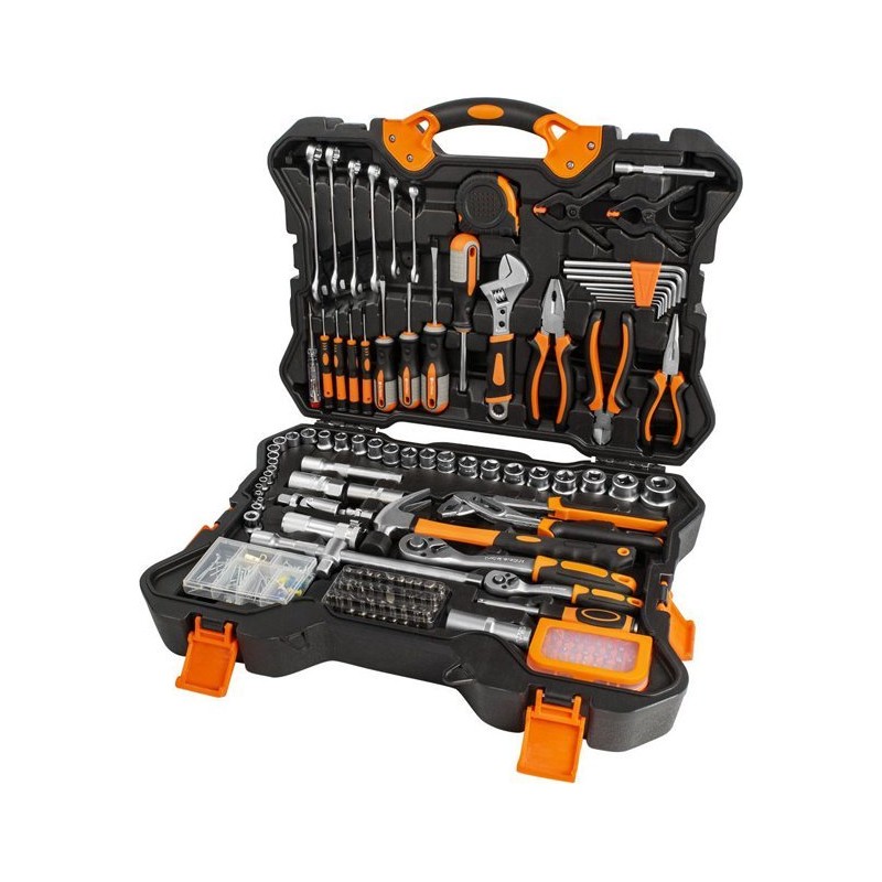 Das Set enthält wichtige Werkzeuge wie Ringschlüssel, Steckschlüssel, Verlängerungen, Zangen und Schraubendreher. Darüber hinaus finden Nutzer darin eine LED-Taschenlampe und ein Maßband, was es zu einem vielseitigen Werkzeug für jedermann macht.