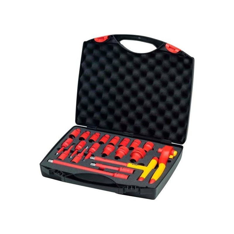 Bei Arbeiten an unter Spannung stehenden Bauteilen steht die Sicherheit des Anwenders an erster Stelle. Elektriker sind mit diesem Werkzeugset, das eine Zange, einen T-Griff und einen Präzisionsschraubendreher umfasst, bestens für die Arbeit gerüstet. Dank der beiliegenden Zange mit Rechts-/Linkslauf ist der Wechsel der Steckschlüsseleinsätze kinderleicht. Durch Drücken des Entriegelungsknopfes werden die Steckschlüsseleinsätze mechanisch arretiert. Um flexibel arbeiten zu können, ist im Set auch ein T-Griff electric enthalten. Damit lassen sich selbst tief sitzende Schrauben mühelos erreichen. Darüber hinaus bietet die Auswahl an Steckschlüsseleinsätzen mit Innen- und Außensechskant sowie Verlängerungen dem Anwender die nötige Flexibilität bei der Arbeit. Zange, T-Griff, Präzisionsschraubendreher und Verlängerungen sind übersichtlich in einem praktischen und robusten Etui untergebracht. Jedes Werkzeug im Set wird gemäß der internationalen Norm IEC 60900 einzeln geprüft und ermöglicht sicheres Arbeiten an Bauteilen mit einer Spannung von bis zu 1000 V AC.