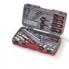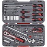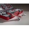 95-teiliges Set, z. B. für den Einsatz im Baugewerbe. Das Set enthält 1/4"- und 1/2"-Steckschlüssel sowie einen glasfaserverstärkten Ratschenknopf, Steckschlüsseleinsätze, Universalgelenke, Verbindungsstücke und Zwischensteckschlüssel. Darüber hinaus enthält es Ring-Maulschlüssel, Sechskantschlüssel, Schraubendreher sowie Wechselbits. Geliefert in einer roten Kunststoffbox mit Sicherheitsverschluss aus Metall, klappbarem Griff und Scharnier mit Metallachse. An der Unterseite der Box befinden sich rutschfeste Gummifüße.