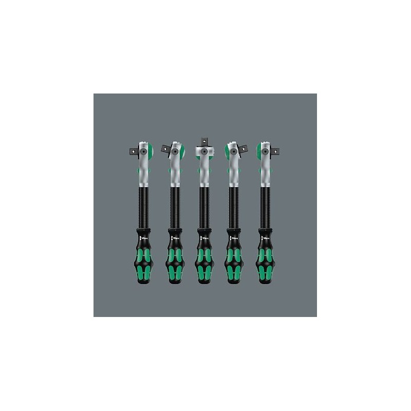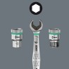 43-teiliges Zyklop-Set in einem robusten Metallkoffer: 1 Zyklop-Ratsche mit 1/4"-Antrieb, 1 Zyklop-Ratsche mit 1/2"-Antrieb. Feine Verzahnung mit 72 Zähnen für einen geringen Arbeitswinkel von 5°. Die Ratsche verfügt über einen schwenkbaren Kopf, der dank des beidseitig angebrachten Arretierungsschalters in jeder Position arretiert werden kann. Dies garantiert problemloses Arbeiten auch an sehr engen oder schwer zugänglichen Stellen und bietet ausreichend Bewegungsfreiheit für die Hand. Die Arretierung des Kopfes in den Positionen 0°, 15° sowie 90° nach rechts und links garantiert sicheres Arbeiten ohne das Risiko, dass der Ratschenkopf „herausrutscht“. In der 0°-Position und bei Verwendung eines Adapters und eines Bits oder einer Spitze kann er wie ein Standard-Schraubendreher verwendet werden. Die Konstruktion, die das Eigengewicht des Werkzeugs nutzt, ermöglicht eine deutliche Beschleunigung der Montage. Der achsensymmetrische Kraftform-Griff ermöglicht zusammen mit der drehbaren Hülse schnelles Drehen. Die Form des Kraftform-Griffs passt sich perfekt der Handform an und schützt sie vor Blasen und Druckstellen. Die harten Materialbereiche des Griffs ermöglichen schnelles Drehen, ohne dass die Hand am Griff „klebenbleibt“. Weiche, rutschfeste Bereiche ermöglichen die verlustfreie Übertragung großer Kräfte. Für Steckschlüssel und Adapter mit 1/4“-Vierkantaufnahme, mit Kugelrastung. 21 Zyklop-Steckschlüssel, 2 Zyklop-Verlängerungen mit Drehhülse, 1 Kraftform-Griff mit Halterung für Bits und Aufsätze sowie Schnellwechselhalterung; 16 Aufsätze. Mit dem Wera-Werkzeugsuchsystem „Take it easy“: Farbcodierung der Steckschlüssel nach Größe.