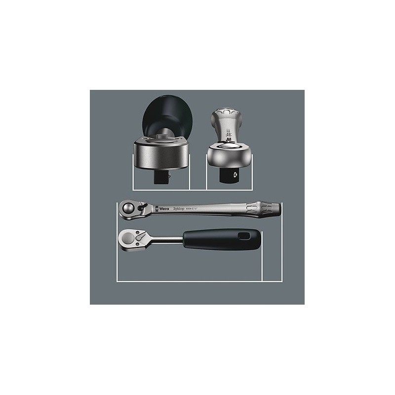 • Zyklop Metal Ratsche 1/2'' 8004 C (72 Zähne, kleiner Rückstellwinkel der Sperrklinke 5°) mit Umschalthebel; schlanke Bauweise für sehr enge Einbauräume