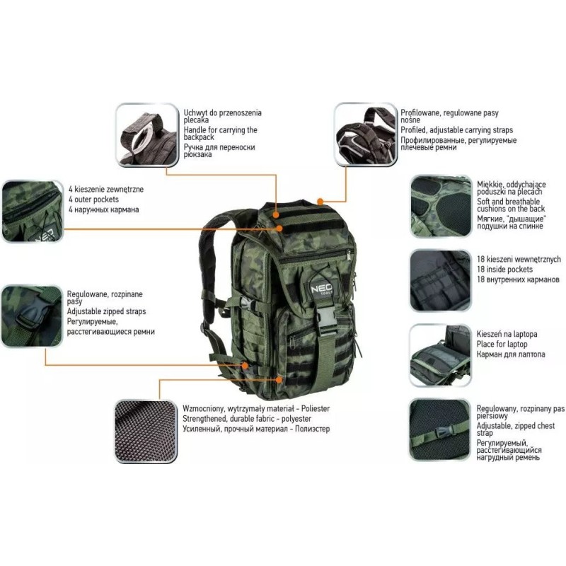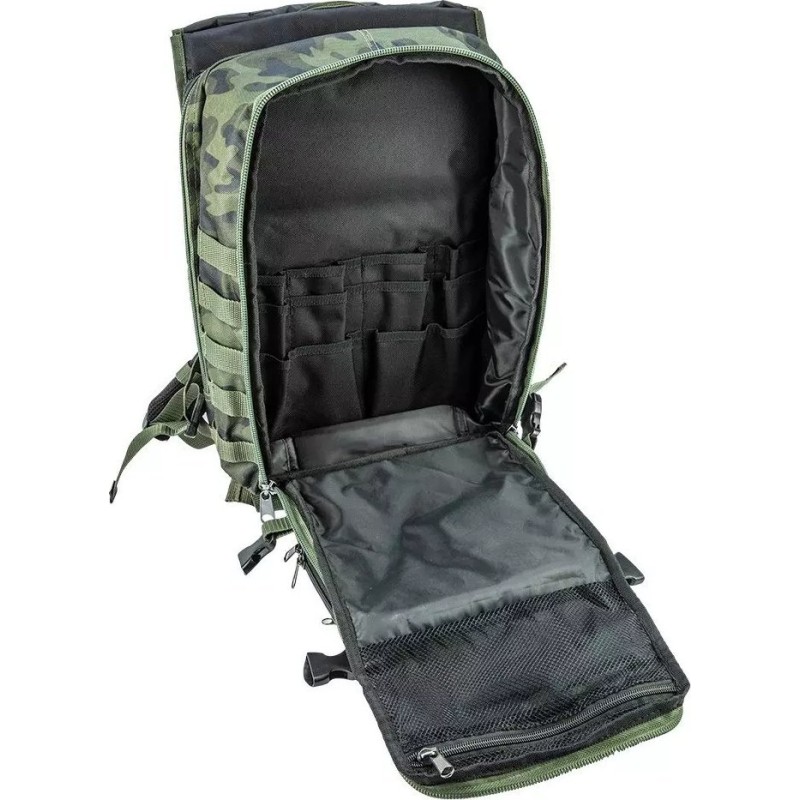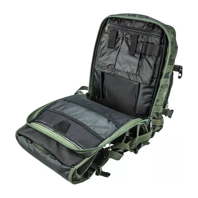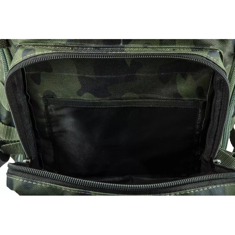 Bequemer taktischer Rucksack mit geräumigem Hauptfach. Der Rucksack bietet Platz für 30 Liter Inhalt und schützt diesen. Für eine bequeme Aufbewahrung verfügt er über 18 Innentaschen sowie 4 zusätzliche Außentaschen mit Reißverschluss. Dank seiner Konstruktion ist der Rucksack äußerst komfortabel im Gebrauch. Er verfügt über verstellbare Schultergurte, einen verstellbaren Brust- und Hüftgurt, Polster am Rücken, seitliche und obere Spanngurte sowie zusätzliche Riemen.