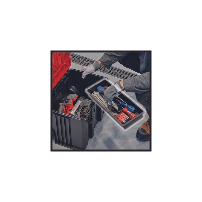 Einhell E-Case L. Produkttyp: Werkzeugkoffer, Material: Polypropylen, Produktfarbe: Schwarz, Rot. Innenbreite: 41,5 cm, Innentiefe: 27,3 cm, Innenhöhe: 32 cm