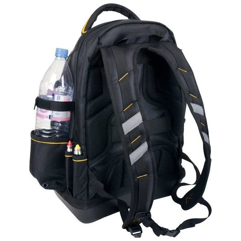 Der Rucksack hat ein Fassungsvermögen von 25 l, ist ergonomisch gestaltet und aus robustem 1680D-Nylon gefertigt. Der Rucksack selbst eignet sich ideal zum Aufbewahren und Transportieren unserer Ausrüstung. Wir können viele verschiedene Werkzeuge darin verstauen, aber vergessen Sie nicht, dass der Rucksack keine Werkzeuge enthält! Bequeme, gepolsterte Schultergurte sorgen für maximalen Komfort. Ein Stützgurt mit Schnalle sorgt zudem dafür, dass der Rucksack nicht vom Rücken rutscht. Darüber hinaus verfügt der Rucksack über ein Laptopfach, sodass man ihn auf Geschäftsreisen mitnehmen kann. Der Kunststoffboden des Rucksacks sorgt für einen stabilen Stand und schützt ihn auf nassen Oberflächen. Im gesamten Innenraum des Rucksacks befinden sich insgesamt 35 Fächer, was für Werkzeuge wirklich viel ist. Der Rucksack bietet problemlos Platz für all unsere Lieblingswerkzeuge! Der Rucksack ist in Schwarz-Gelb erhältlich.