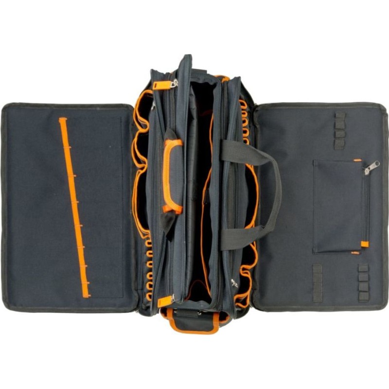 Diese kompakte Werkzeugtasche mit zahlreichen Taschen und Fächern bietet ausreichend Platz für verschiedene Handwerkzeuge wie Zangen, Schraubenschlüssel, Schraubendreher usw. Darüber hinaus ist sie mit speziellen Halterungen für Handy, Karten und Maßband ausgestattet. Die Tasche besteht aus einer Kombination aus 600- und 1680-Den-Polyester und hat einen festen Polypropylen-Boden, wodurch sie abriebfest ist.
