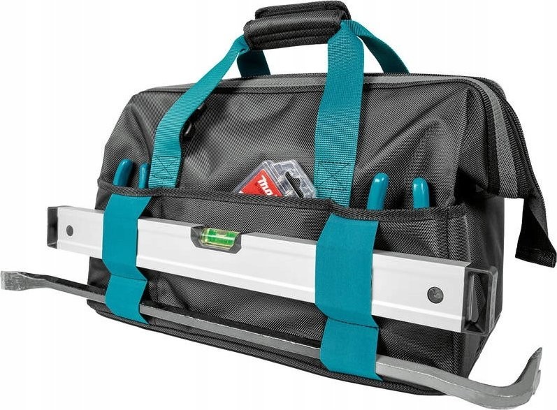 Werkzeugtasche mit Reißverschluss und einer verstärkten, großen Öffnung, die einen guten Überblick über den Inhalt gewährleistet. Die Tasche verfügt über zahlreiche Innen- und Außenfächer sowie elastische Bänder zur sicheren Aufbewahrung von Zubehör und Handwerkzeugen.