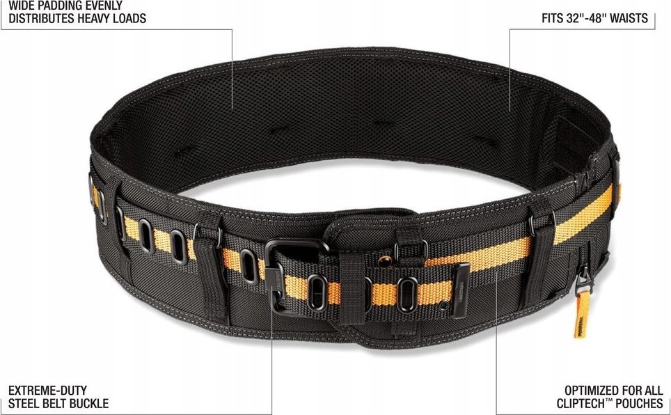 • Der gepolsterte Gurt mit Stahlschnalle ToughBuilt TB-CT-40P ist der erste Werkzeuggürtel, der sich wirklich gut an jede Größe anpassen lässt. Die Erweiterung des Polsters am Verschluss ist komfortabel und passt für Taillenweiten von 32" bis 48" – ohne dass das Polster geknickt werden muss. Ausgestattet mit einer einzigartigen Längenverstellung verfügt der ToughBuilt TB-CT-40P-Gürtel über ein Stahlende, mit dem der Benutzer den Gürtel auf die gewünschte Länge einstellen kann, wodurch das Umfalten von überschüssigem Material entfällt. Der ToughBuilt-Gürtel TB-CT-40P ist für die Verwendung mit allen ClipTech-Taschen optimiert und verfügt über einzigartige, robuste Stahlschnallen, die aus hochwertigen Materialien gefertigt sind und mit einem bequemen Futter ausgestattet sind.