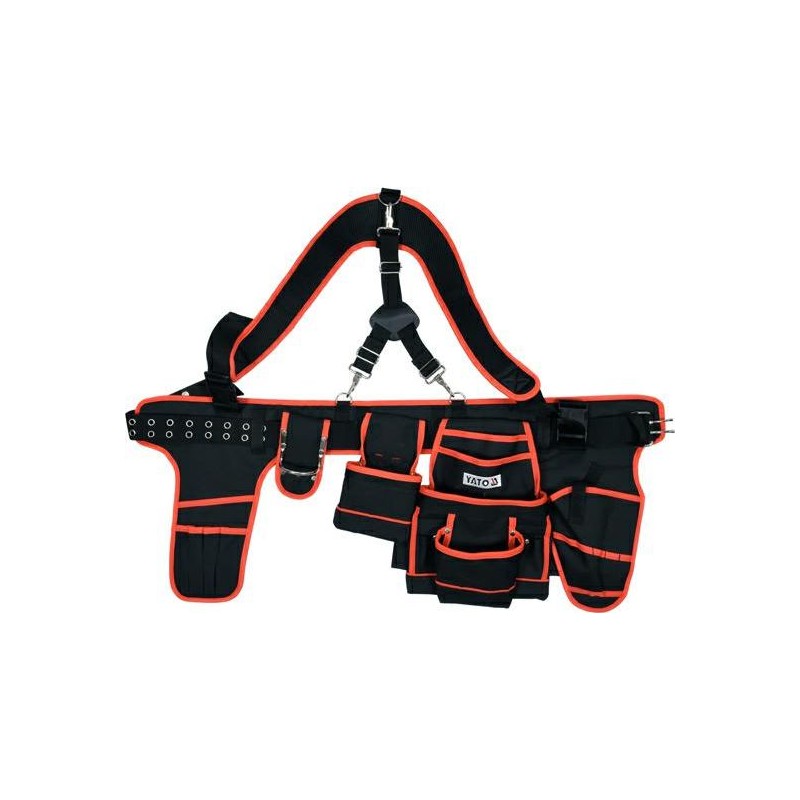 Werkzeuggürtel an Hosenträgern mit zwei aufsteckbaren großen Halterungen für Elektrowerkzeuge, einem Metallhalter für einen Hammer und einer tiefen Tasche für Nägel oder Schrauben. Die Länge des Hauptgürtels, der mit einer Metallschnalle geschlossen wird, beträgt ca. 1280 mm. Er ist mit einem breiten Tragegurt verbunden, der an breiten Hosenträgern befestigt ist. Die Schultergurte verteilen die Last und verlagern sie von den Hüften auf die Schultern. Diese Konstruktion des Gürtels erleichtert die Arbeit mit schwereren Lasten. Das gesamte Produkt ist aus dem technischen, wasserabweisenden Polyestergewebe OXFORD 600D gefertigt.