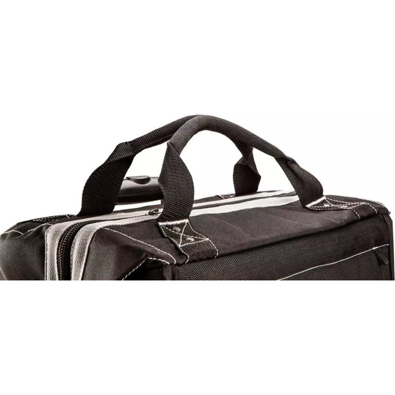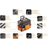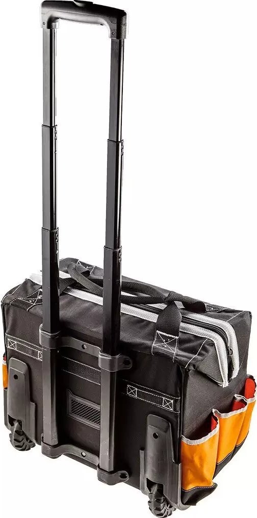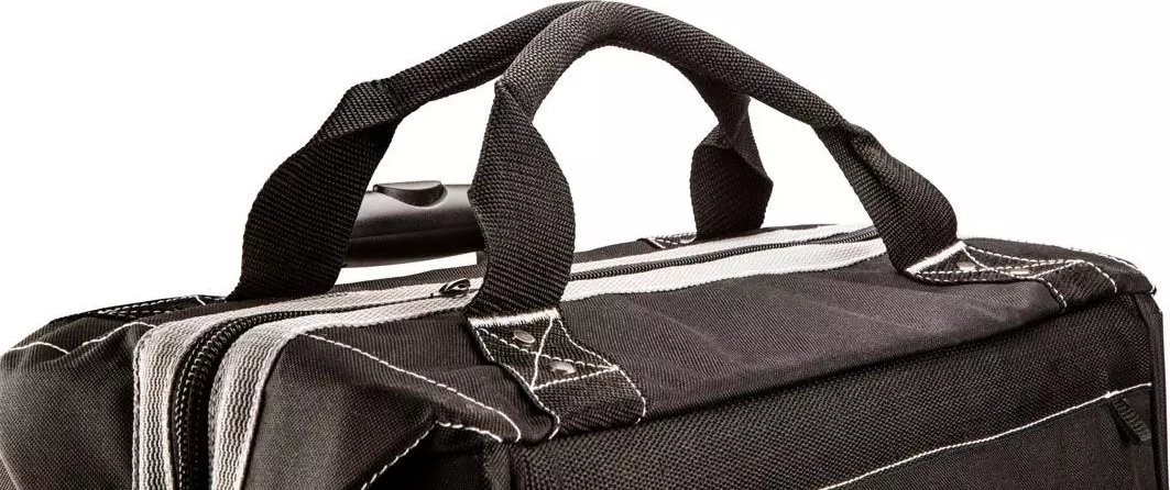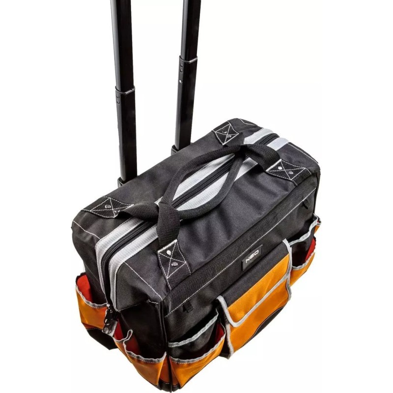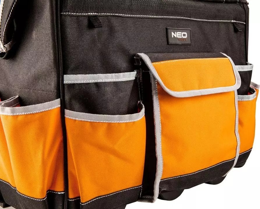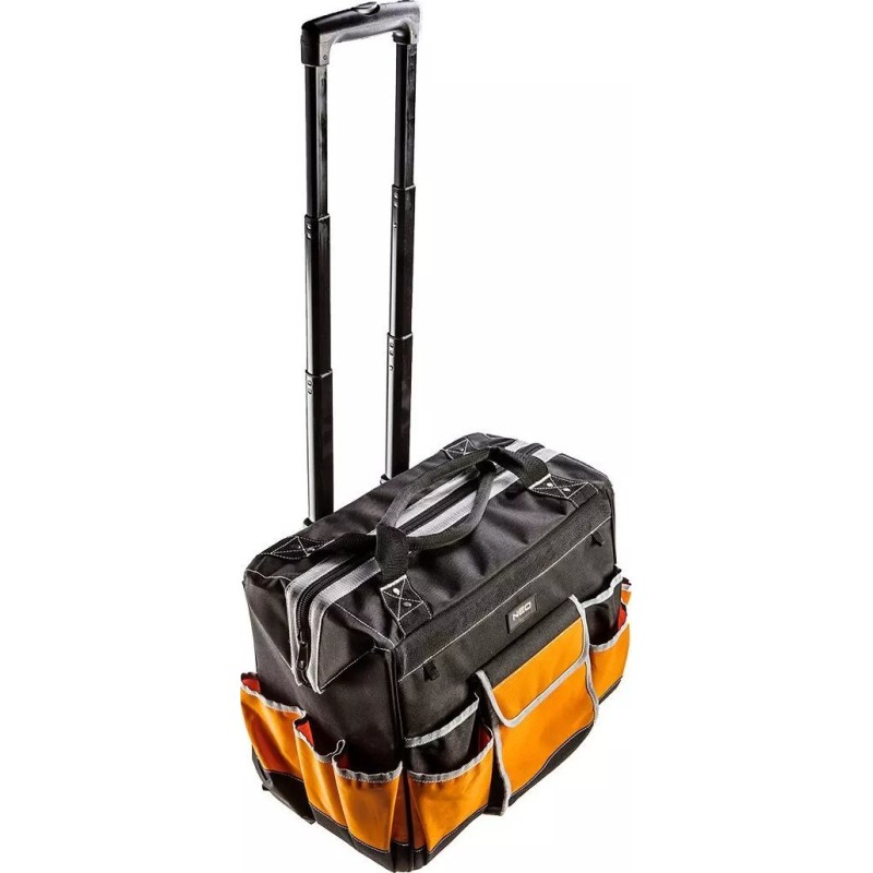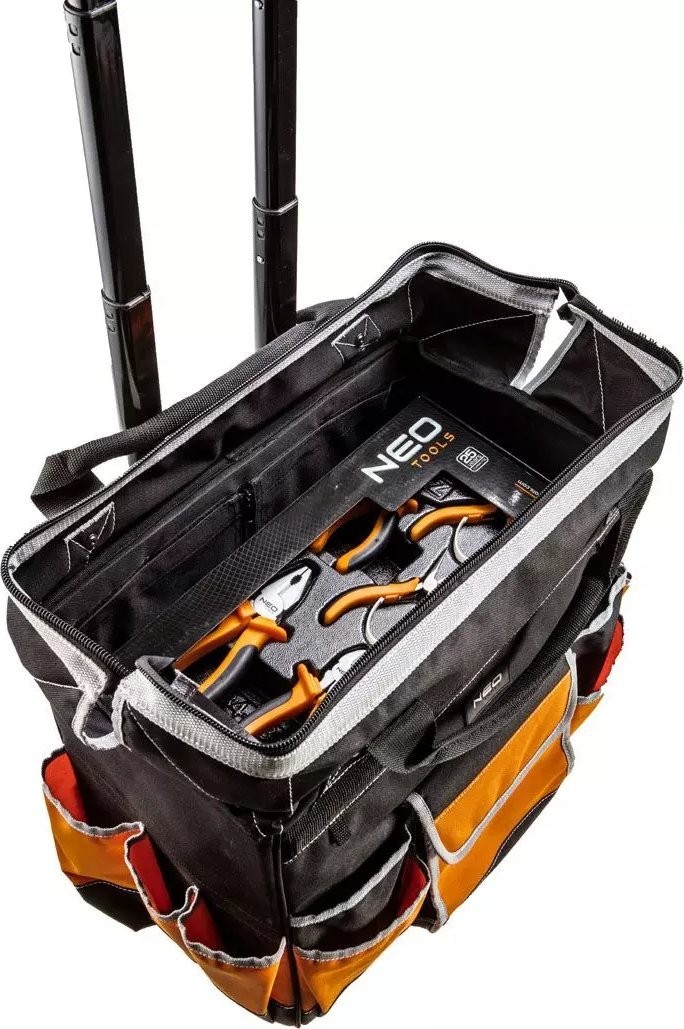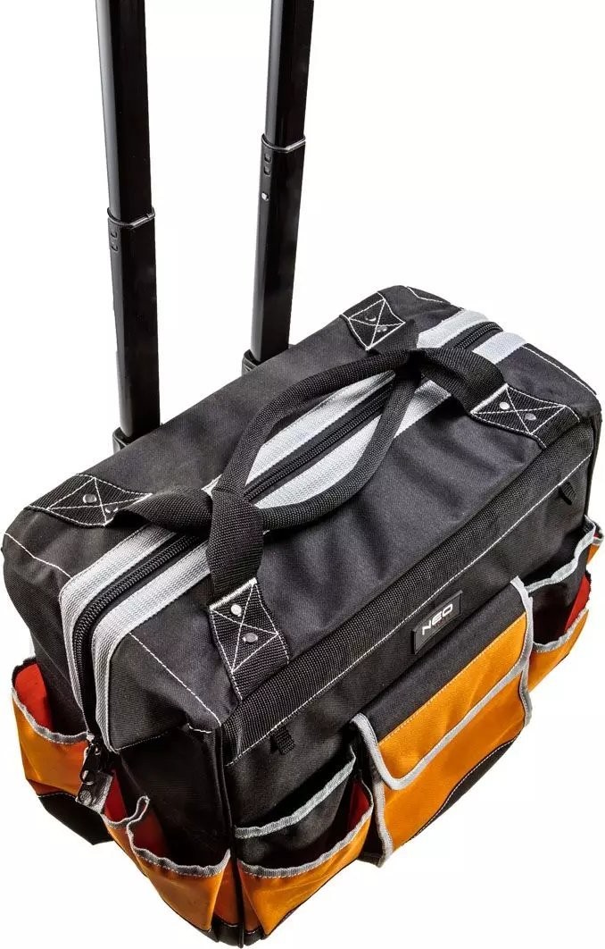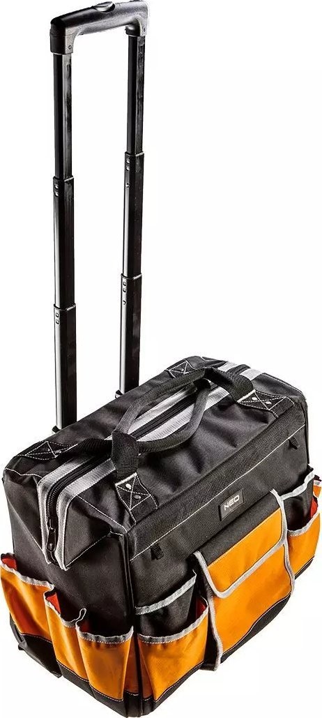 Langlebige Tasche. Mit versteifter Konstruktion sowie verstärkten Nähten und Reißverschlüssen. Ein Teleskopgriff mit Arretierung sowie robuste Rollen erleichtern den Transport schwerer Lasten. Die Tasche ist mit einem stabilen, mit Nieten verstärkten Griff ausgestattet. 11 Innentaschen und 6 Außentaschen sowie ein großes Hauptfach ermöglichen die Aufbewahrung und den Transport zahlreicher Werkzeuge. Die Marke NEO erfüllt die Erwartungen von Profis.
