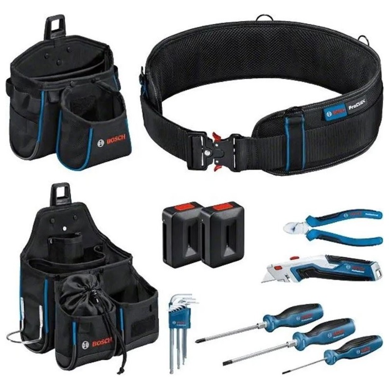 Bosch Professional: ProClick 108-Werkzeuggürtel, Werkzeugtaschen GWT 2 und GWT 4, 3 Schraubendreher, 9-teiliges Sechskantschlüsselset, Kombizange und einklappbares Universalmesser