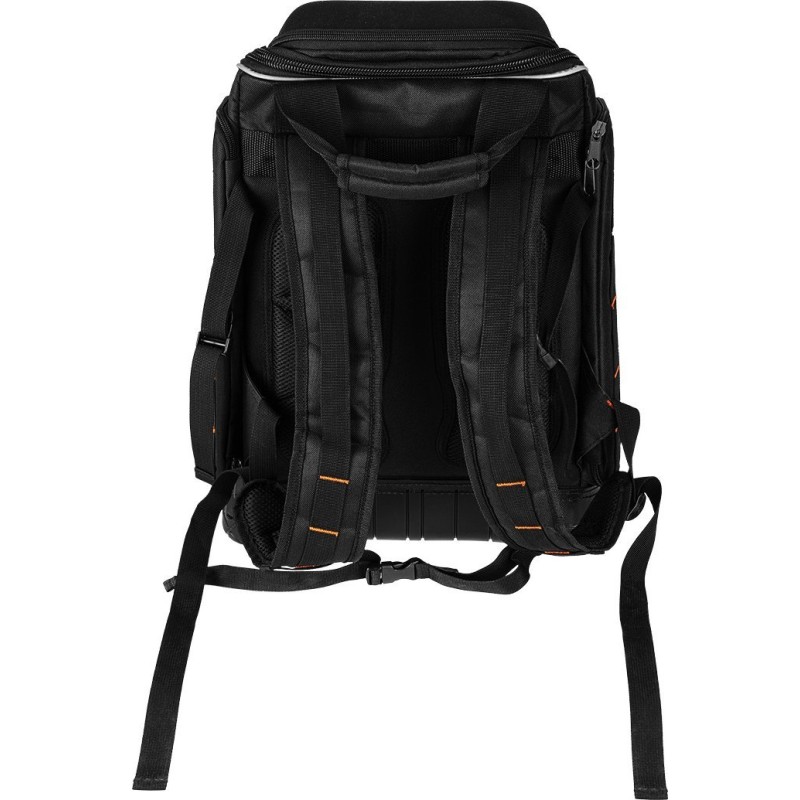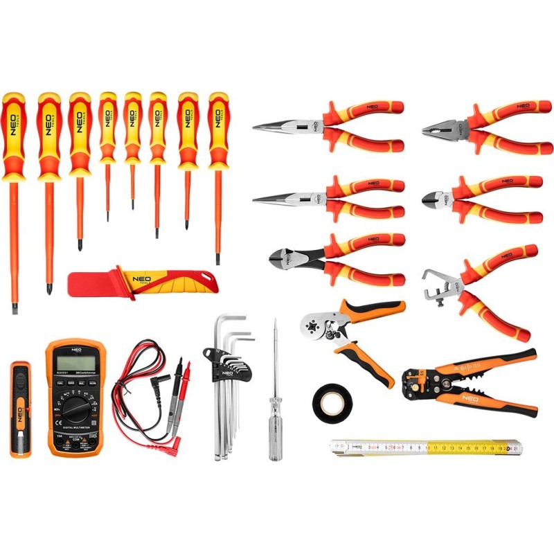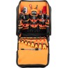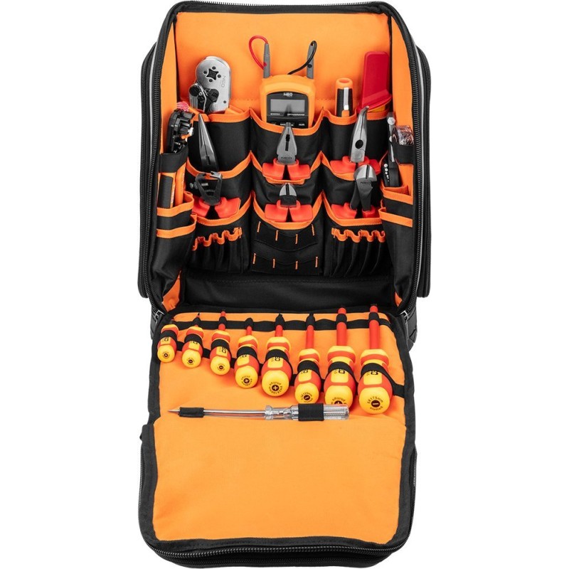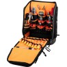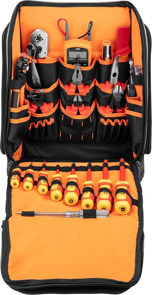 Elektriker-Rucksack mit 31 Fächern, Fassungsvermögen 20 l, 7 Außentaschen, 19 Innentaschen, Material: 600D-Polyester, Maße: Breite 370 mm, Tiefe 275 mm, Höhe 515 mm, gummierte Rucksacksohle, starrer Rucksackrahmen, Werkzeuge: CrV-Material, Zweikomponenten-Griff, isolierte Universalzange 180 mm, isolierte Seitenzange 160 mm, isolierte verlängerte gerade Zange 200 mm, isolierte, gebogene, verlängerte Zange 200 mm, isolierte Abisolierzange 160 mm, isolierte Seitenzange 180 mm, Schraubendreher: Material S2, Zweikomponentengriff, isolierte Kreuzschlitzschraubendreher PH0x60 mm, PH1x80 mm, PH2x100 mm, PH3x150 mm, Flachschraubendreher SL2,5x75 mm, SL4x100 mm, SL5,5x125 mm, SL8x175 mm, Spannungsprüfer 190 mm 100–250 V, Isolierband schwarz 19 mm x 10 m, Rohrisolierabzieher 0,34–6 mm², RG 6/59, 8–13 mm², Crimpzange für Hülsenstecker 170 mm, 0,25–6 mm², Zollstock 2 m, Isoliermesser mit Isolieraufspreizplatte 190 mm, Sechskantschlüssel 9 Stück CrV-Stahl, Größen 1,5, 2, 2,5, 3, 4, 5, 6, 8, 10 mm, Abisolierzange 0,5–6 mm², Multimeter V DC Bereich 0–600 V, V AC Bereich 0–600 V, A DC Bereich 0–10 A, A AC Bereich 0–10 A, Ohm-Bereich 0–200 M, Sicherheitskategorie CAT III 600 V, Durchgangsprüfung, 20 kHz, hintergrundbeleuchtetes Display 1999, Lautsprecher, 0–2 mF, automatische Abschaltung, HOLD-Funktion, Gewicht 176 g.