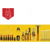 • Im Lieferumfang enthalten sind ein 10-teiliger Steckschlüsselsatz, ein 14-teiliger Bitsatz, sieben ergonomische Schraubendreher und ein kleiner, kompakter Stubby, die sich für alle Arbeiten zum Festziehen eignen. Das Festhalten und Durchtrennen des Werkstücks erleichtern eine Universalzange, eine verstellbare Zange und eine verstärkte Seitenschneiderzange.