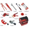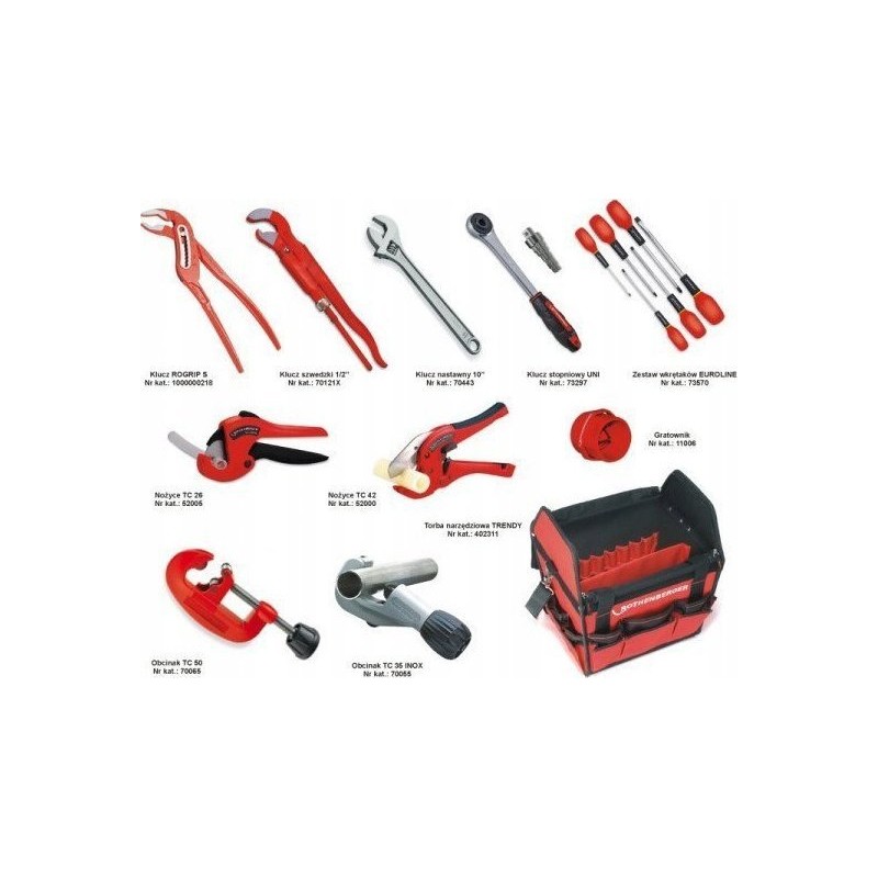 Das unverzichtbare Set für Installateure. Die wichtigsten Werkzeuge in einer praktischen Tasche. DER SATZ ENTHÄLT: Rohrschere TC 42 (Nr. 52000): für Rohre aus PP, PE usw. bis 42 mm Rohrschere TC 26 (Nr. 52005): für Mehrschichtrohre bis 26 mm 1/2”-Steckschlüssel (Nr. 70121X): der bekannte und bewährte Steckschlüssel UNI-Steckschlüssel (Nr. 73297): ideal für Verschraubungen und Verlängerungen, inklusive Weihnachtsbaum und Ratsche TC 50-Kupferrohrschneider (Nr. 70065): robuster Rohrschneider im Bereich von 12–50 mm Rohrschneider TC 35 INOX (Nr. 70055): für Edelstahlrohre im Bereich von 6–35 mm ROGRIP-Schlüssel S 2” (Nr. 1000000218): neueste Konstruktion, bis 2" EUROLINE-Schraubendreher-Set (Nr. 73570): sechs Schraubendreher mit magnetischen Bits Rohrentgrater bis 36 mm (Nr. 11006): ermöglicht das Entgraten von Außen- und Innenkanten von Kupferrohren Einstellbarer Schraubenschlüssel 10” (Nr. 70443): universeller Einstellschlüssel Das Ganze in einer TRENDY-Tasche (Nr. 402311): praktische Tasche mit vielen Fächern, Trennwand, Reißverschluss, sehr geräumig (ca. 42 l), mit Griffen und Schultergurt. **...