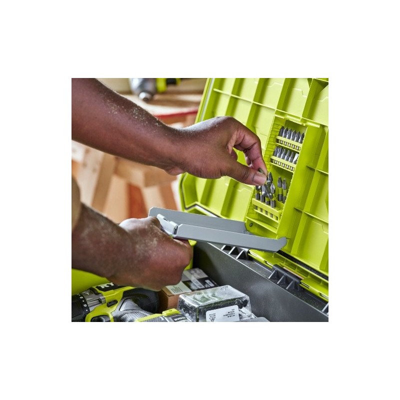 Die Ryobi RSL201 verfügt über einen integrierten Bitsortierer und ein Fach für Zubehör, was für maximale Ordnung bei den Werkzeugen sorgt. So sind alle notwendigen Teile immer griffbereit, was die Arbeit erheblich erleichtert. Darüber hinaus erhöht die Möglichkeit, Gegenstände mit einem Vorhängeschloss zu sichern, die Sicherheit der aufbewahrten Werkzeuge.