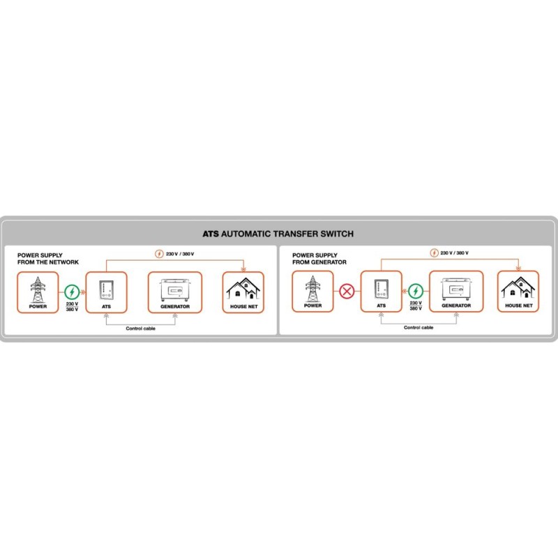 • Automatischer Start des Aggregats bei Stromausfall oder Spannungsabfall im Hauptnetz